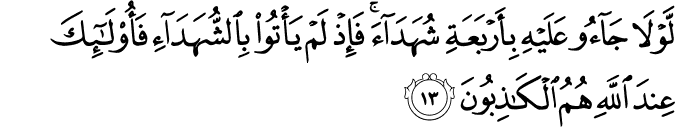 Translation:Why did the slanderers not bring four witnesses (to prove their charge)? Now that they have not brought witnesses, they themselves are liars in the sight of Allah.