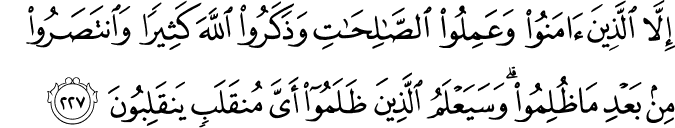 Translit: Illa allatheena amanoo waAAamiloo alssalihati wathakaroo Allaha katheeran waintasaroo min baAAdi ma thulimoo wasayaAAlamu allatheena thalamoo ayya munqalabin yanqaliboona