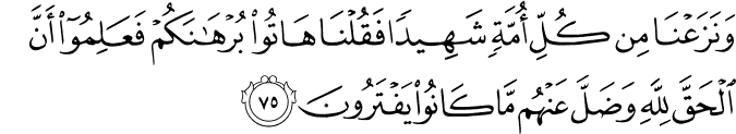 Translit: WanazaAAna min kulli ommatin shaheedan faqulna hatoo burhanakum faAAalimoo anna alhaqqa lillahi wadalla AAanhum ma kanoo yaftaroona