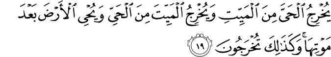 Translit: Yukhriju alhayya mina almayyiti wayukhriju almayyita mina alhayyi wayuhyee alarda baAAda mawtiha wakathalika tukhrajoona