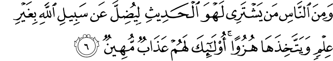 Translit: Wamina alnnasi man yashtaree lahwa alhadeethi liyudilla AAan sabeeli Allahi bighayri AAilmin wayattakhithaha huzuwan olaika lahum AAathabun muheenun