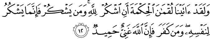 Translit: Walaqad atayna luqmana alhikmata ani oshkur lillahi waman yashkur fainnama yashkuru linafsihi waman kafara fainna Allaha ghaniyyun hameedun