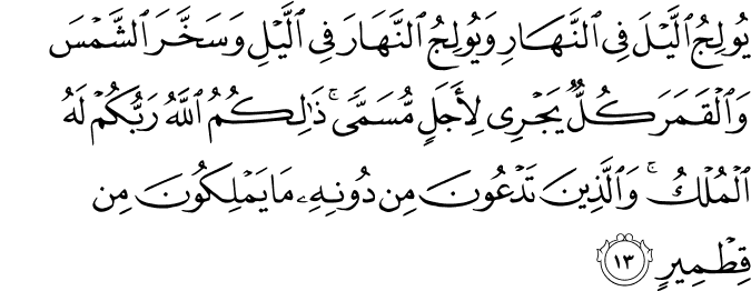 Translit: Yooliju allayla fee alnnahari wayooliju alnnahara fee allayli wasakhkhara alshshamsa waalqamara kullun yajree liajalin musamman thalikumu Allahu rabbukum lahu almulku waallatheena tadAAoona min doonihi ma yamlikoona min qitmeerin