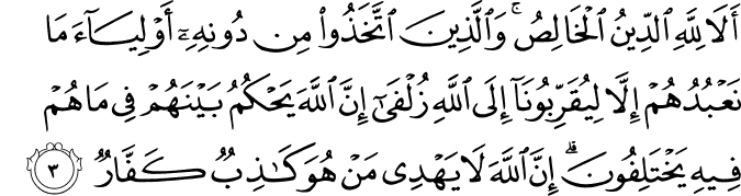 Translit: Ala lillahi alddeenu alkhalisu waallatheena ittakhathoo min doonihi awliyaa ma naAAbuduhum illa liyuqarriboona ila Allahi zulfa inna Allaha yahkumu baynahum fee ma hum feehi yakhtalifoona inna Allaha la yahdee man huwa kathibun kaffarun