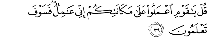 Translit: Qul ya qawmi iAAmaloo AAala makanatikum innee AAamilun fasawfa taAAlamoona