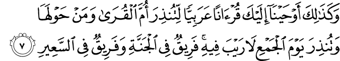 Translation:Yes, thus have We revealed to you, O Prophet, this Arabic Qur'an so that you may warn those who dwell in the center of habitations (i.e. Makkah) and around it, and warn them of the Day of Gathering that which is sure to come. One group shall go to Paradise and the other to Hell.