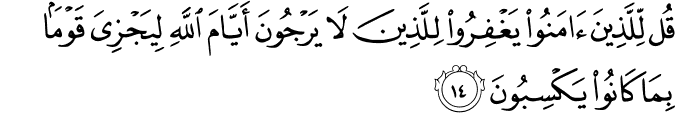 Translit: Qul lillatheena amanoo yaghfiroo lillatheena la yarjoona ayyama Allahi liyajziya qawman bima kanoo yaksiboona