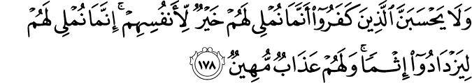 Translit: Wala yahsabanna allatheena kafaroo annama numlee lahum khayrun lianfusihim innama numlee lahum liyazdadoo ithman walahum AAathabun muheenun