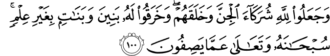Translit: WajaAAaloo lillahi shurakaa aljinna wakhalaqahum wakharaqoo lahu baneena wabanatin bighayri AAilmin subhanahu wataAAala AAamma yasifoona