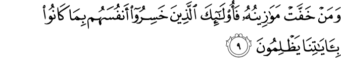 Translit: Waman khaffat mawazeenuhu faolaika allatheena khasiroo anfusahum bima kanoo biayatina yathlimoona