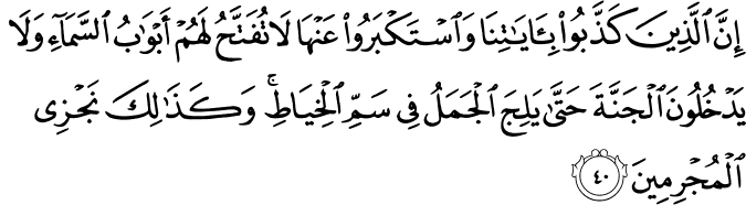 Translation:Believe it that the doors of heaven will not be opened for those who have treated Our Revelations as false and have shown pride in regard to them: their admission into Paradise is as impossible as the passing of the camel through the eye of the needle, so do We recompense the guilty ones. |