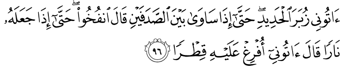 Translation:Come, bring sheets of iron for me. "When he had filled the space between the two mountains, he said to the people, "Now, ply your bellows.รขโฌย They did so till that (iron-wall) became red-hot and he said, "Now let me pour molten brass upon it.รขโฌย |