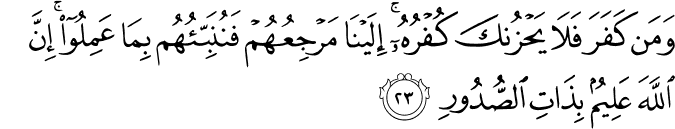Translation:As for the one who disbelieves, let not his disbelief grieve you. To Us they have to return; then We shall tell them what they had been doing. Most surely Allah knows the hidden secrets of the breasts. |