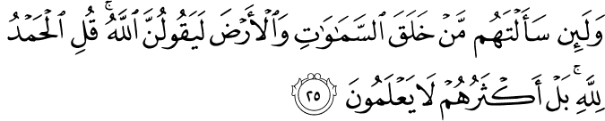 Translation:If you ask them, "Who has created the earth and the heavens?" they will surely say, "Allah." Say, "Praise is then only for Allah," but most of them do not know. |