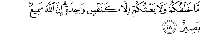 Translation:Your creation and your resurrection are as simple for Him as (the creation and resurrection) of a single soul. The fact is that Allah hears everything and sees everything. |