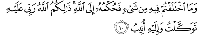 Translation:It is for Allah to give judgment in whatever you may differ. The same Allah is my Lord: in Him did I put my trust, and to Him I turn. |