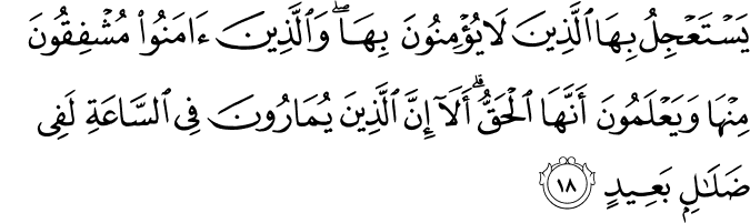 Translation:Those who do not believe in its coming, seek to hasten it, but those who believe in it, dread it, and know that it is sure to come. Note it well that those who dispute concerning the coming of the Hour, in order to create doubts about it, have gone far astray. |