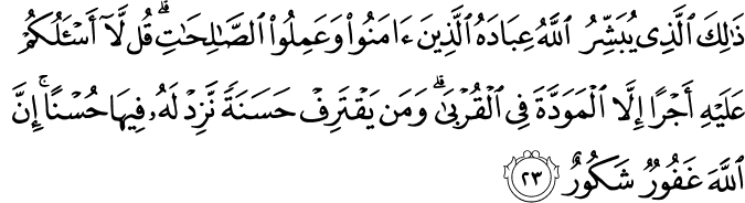 Translation:This is that of which Allah gives good news to His servants, who believed and did good works. O Prophet, say to them: "I do not ask of you any reward for this work. However, I do seek the love of the kindred." Whoever earns a good deed, We shall increase its good for him. Indeed, Allah is All-Forgiving and Appreciative. |