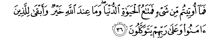 Translation:Whatever you have been given, is merely a provision for the transitory life of this world, and that which is with Allah is better as well as more lasting. That is for those who have believed and put their trust in their Lord. |