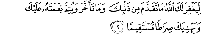 Translation:so that Allah may pardon you your former and latter faults, and may perfect His blessing upon you and show you the right way, |