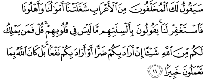 Translation:O Prophet, the desert Arabs who were left behind? will surely come and say to you, "Our properties and our households kept us occupied; so ask forgiveness for us." They say with their tongues that which is not in their hearts. Say to them: "If it is so, who that can have any power to withhold Allah"s decree in your behalf if He intends to do some harm to you or bring some good to you? Allah is well aware of all your actions. |