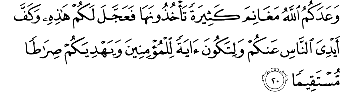 Translation:Allah promises you rich spoils which you will acquire. Presently He has granted you this victory. And has restrained the hands of the people from you so that it they be a sign to the believers, and Allah may guide you to the right way. |