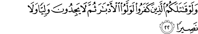 Translation:If the disbelievers had fought you then, they would certainly have turned their backs and would have found no protector or helper. |