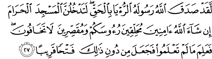 Translation:Indeed, Allah had shown His Messenger a true vision, which was precisely according to the truth, "You shall surely enter the Masjid al-Haram, if Allah so wills, in full security. you will have your heads shaved, your hair cut, and you will have nothing to fear. He knew what you did not know. Therefore, He granted you this near victory before the fulfillment of the vision." |