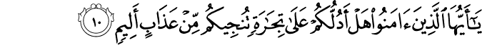 Translation:O you who have believed, shall I tell you of a bargain1 that will save you from a painful torment? |