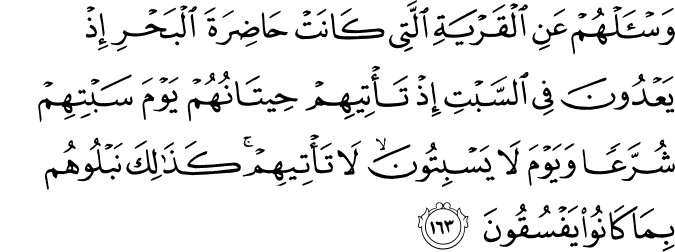 |And ask them about the township which was situated on the sea shore. Remind them of what befell its people who used to break the Sabbath (Saturday). Each Sabbath-day the fish appeared in abundance before them on the surface of the water but did not appear at all on other days than Sabbath. This was because We were putting them to test on account of the acts of disobedience they did.