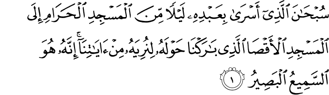 Translit: Subhana allathee asra biAAabdihi laylan mina almasjidi alharami ila almasjidi alaqsa allathee barakna hawlahu linuriyahu min ayatina innahu huwa alssameeAAu albaseeru