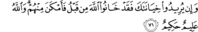 Translit: Wain yureedoo khiyanataka faqad khanoo Allaha min qablu faamkana minhum waAllahu AAaleemun hakeemun