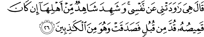 Translit: Qala hiya rawadatnee AAan nafsee washahida shahidun min ahliha in kana qameesuhu qudda min qubulin fasadaqat wahuwa mina alkathibeena