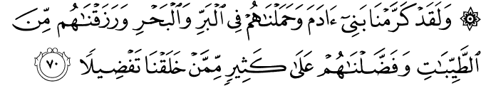 Translit: Walaqad karramna banee adama wahamalnahum fee albarri waalbahri warazaqnahum mina alttayyibati wafaddalnahum AAala katheerin mimman khalaqna tafdeelan