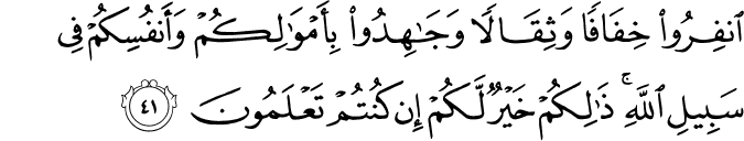 Translit: Infiroo khifafan wathiqalan wajahidoo biamwalikum waanfusikum fee sabeeli Allahi thalikum khayrun lakum in kuntum taAAlamoona
