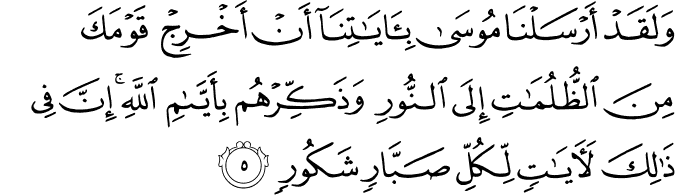 Translit: Walaqad arsalna moosa biayatina an akhrij qawmaka mina alththulumati ila alnnoori wathakkirhum biayyami Allahi inna fee thalika laayatin likulli sabbarin shakoorin