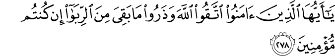 Translit: Ya ayyuha allatheena amanoo ittaqoo Allaha watharoo ma baqiya mina alrriba in kuntum mumineena