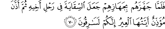 Translit: Falamma jahhazahum bijahazihim jaAAala alssiqayata fee rahli akheehi thumma aththana muaththinun ayyatuha alAAeeru innakum lasariqoona