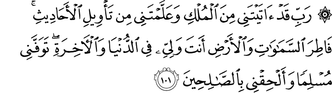 Translit: Rabbi qad ataytanee mina almulki waAAallamtanee min taweeli alahadeethi fatira alssamawati waalardi anta waliyyee fee alddunya waalakhirati tawaffanee musliman waalhiqnee bialssaliheena