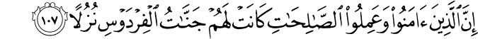 Translit: Inna allatheena amanoo waAAamiloo alssalihati kanat lahum jannatu alfirdawsi nuzulan