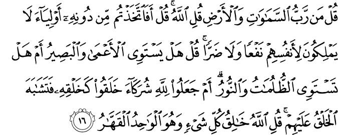Translit: Qul man rabbu alssamawati waalardi quli Allahu qul afaittakhathtum min doonihi awliyaa la yamlikoona lianfusihim nafAAan wala darran qul hal yastawee alaAAma waalbaseeru am hal tastawee alththulumatu waalnnooru am jaAAaloo lillahi shurakaa khalaqoo kakhalqihi fatashabaha alkhalqu AAalayhim quli Allahu khaliqu kulli shayin wahuwa alwahidu alqahharu