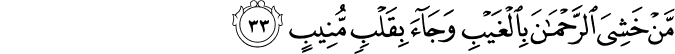 Translit: Man khashiya alrrahmana bialghaybi wajaa biqalbin muneebin