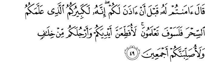 Translit: Qala amantum lahu qabla an athana lakum innahu lakabeerukumu allathee AAallamakumu alssihra falasawfa taAAlamoona laoqattiAAanna aydiyakum waarjulakum min khilafin walaosallibannakum ajmaAAeena