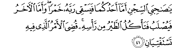 Translit: Ya sahibayi alssijni amma ahadukuma fayasqee rabbahu khamran waamma alakharu fayuslabu fatakulu alttayru min rasihi qudiya alamru allathee feehi tastaftiyani