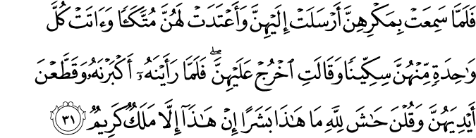 Translation: The king said, "Bring him to me." But when the royal envoy came to him, Joseph said,42 "Go back to your lord and ask him to inquire about the matter of the women who cut their hands. Indeed my Lord has full knowledge of their cunning."aydiyahunna | aydiyahunna | word: َيدِيَهُنَّ