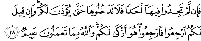 Translit: Fain lam tajidoo feeha ahadan fala tadkhulooha hatta yuthana lakum wain qeela lakumu irjiAAoo fairjiAAoo huwa azka lakum waAllahu bima taAAmaloona AAaleemun