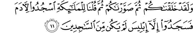 Translit: Walaqad khalaqnakum thumma sawwarnakum thumma qulna lilmalaikati osjudoo liadama fasajadoo illa ibleesa lam yakun mina alssajideena