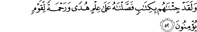 Translit: Walaqad jinahum bikitabin fassalnahu AAala AAilmin hudan warahmatan liqawmin yuminoona