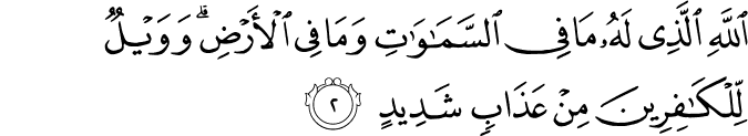 Translit: Allahi allathee lahu ma fee alssamawati wama fee alardi wawaylun lilkafireena min AAathabin shadeedin