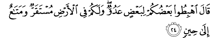 Translit: Qala ihbitoo baAAdukum libaAAdin AAaduwwun walakum fee alardi mustaqarrun wamataAAun ila heenin